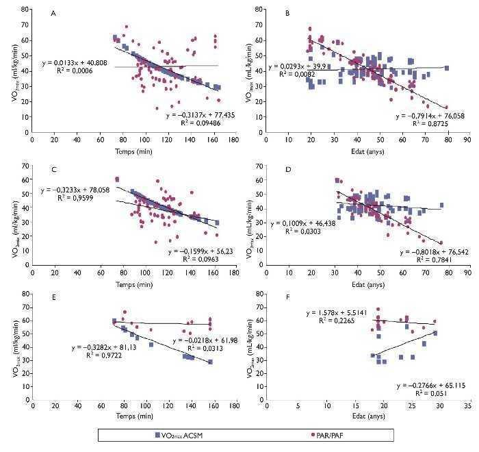 Figura 2 Correlacions del VO2màx mitjançant l'equació de predicció ACSM i PAR/PAF per temps d'arribada i edats. (Per a més detalls, vegeu el text.)