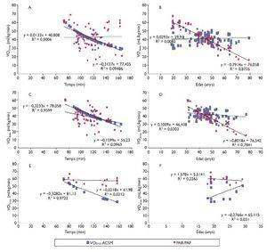 Estimació de la capacitat funcional. La taula IV mostra el resultat de la capacitat física percebuda amb el qüestionari PAR/PAF i de l'ACSM i la seva distribució percentil. La mitjana d'ambdós mètodes per determinar el VO2màx va ser de 42,4 ± 11,8 i 41,1 ± 7,2, respectivament. La figura 2 mostra les correlacions entre el càlcul de l'ACSM i el qüestionari PAR/ PAF: [A] correlació entre l'ACSM i el PAR/PAF, en funció del mateix temps d'arribada (p < 0,001, r2 = 0,94), (pNS, r2 = 0,00) i [B] en funció de l'edat (pNS, r2 = 0,00), (p < 0,001, r2 = 0,87), n = 81, respectivament. En diferenciar-los per grups d'edat, amb el càlcul de l'ACSM i el PAR/PAF en majors de 30 anys [C], es va trobar una important correlació en funció del mateix temps d'arribada (p < 0,001, r2 = 0,95), (pNS, r2 = 0,09), respectivament. Resultats contraris en funció de l'edat, ACSM (pNS, r2 = 0,03), PAR/PAF (p < 0,001, r2 = 0,78) [D]. En menors de 30 anys, comparats els mètodes amb el temps d'arribada [E], el càlcul de l'ACSM va demostrar una alta correlació (p < 0,001, r2 = 0,97), contrari al càlcul del PAR/PAF (pNS, r2 = 0,03). En comparar ambdós mètodes i la seva relació amb l'edat, no es van trobar correlacions significatives (r2 = 0,22) i (r2 = 0,05) [F].