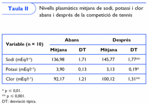 En la taula II es mostren els valors plasmàtics mitjans, obtinguts abans i després de la competició de tennis per al sodi (136,98 ± 1,71 respecte de 145,77 ± 1,77 mEq/l-1), potassi (3,90 ± 0,13 respecte de 3,13 ± 0,19 mEq/l-1) i clor (92,17 ± 1,21 respecte de 100,12 ± 1,31 mEq/l-1). Els asteriscos indiquen la significació estadística en comparar ambdues situacions (*p ≤ 0,01) (**p ≤ 0,001).