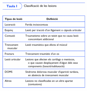 Les lesions es van classificar en traumàtiques o de sobreús (overuse). Per a la definició de lesió de sobreús es va utilitzar la proposta per Hagglund9, considerant com a tal la "síndrome dolorosa de l'aparell musculoesquelètic de començament insidiós, sense traumatisme o patologia prèvia que justifiqui els símptomes".