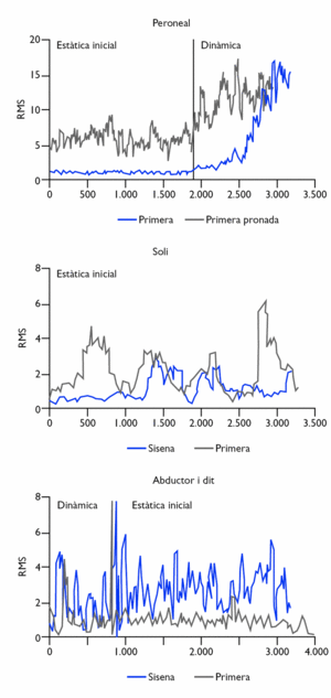 Comparant la forma de la corba de RMS, en cada subjecte i en cada posició, es pot observar que durant el relevé el gastrocnemi lateral s'activa més tard que el medial, malgrat que presenta una fase d'ascens més ràpida o pronunciada; el gastrocnemi medial presenta valors de RMS més alts que el gastrocnemi lateral; finalment, la corba del múscul peroneal és semblant a la del gastrocnemi lateral (fig. 12).
