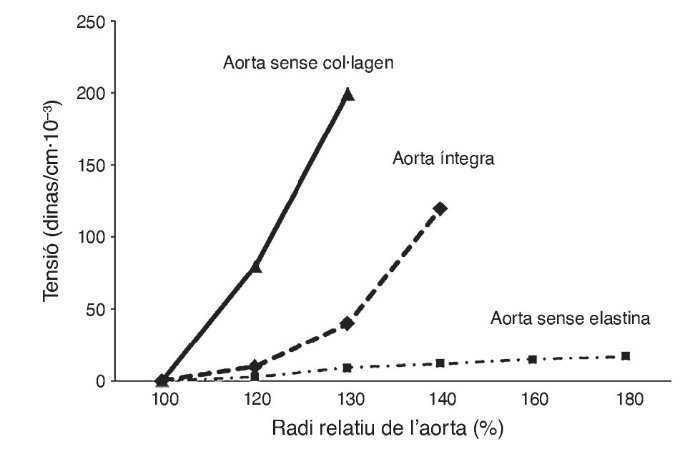 L’explicació donada per Wagenseil i Mecham13 és que, a grans valors de tensió, l’aorta també és distensible, però no l’elastina, sinó el col·lagen, de manera que en un valor determinat predominen les característiques del col·lagen perquè la paret és relativament inextensible. Com que els vasos elàstics estan sotmesos a variacions cícliques de la pressió, significa que aquests vasos «s’expandeixen i contrauen» amb els canvis de pressió. Això evita que els vasos es trobin sotmesos a pressions molt elevades. A la figura 1 es mostra el comportament del vas íntegre, sense col·lagen o elastina. Observeu com es desplaça la relació ràdio/tensió vers el col·lagen quan la tensió és elevada i vers l’elastina quan la tensió és baixa. L’aorta íntegra mostra un comportament mitjà, que de l’anàlisi de la figura es dedueix que no és el resultat d’una suma algebraica dels comportaments quan la paret està sense col·lagen o sense elastina.