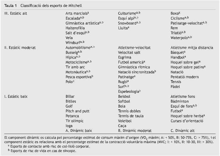 L’actualització recent de la conferència de Bethesda4 aporta recomanacions de nivell C (opinió d’experts) per als esportistes competitius, però en alguns punts difereix de les recomanacions europees en miocardiopaties i valvulopaties5, arítmies i canalopaties6,7, i cardiopaties congènites8. El grup de cardiologia esportiva de la Societat Europea de Cardiologia9 inclogué recomanacions per als esportistes no competitius, és a dir, els que practiquen esport recreatiu i activitat física en general, que no havien estat incorporades en recomanacions prèvies; també en dita publicació s’afegeix un canvi d’utilitat pràctica en el moment de fer una recomanació mèdica per a la pràctica de l’esport, canviant el component dinàmic de la classificació de Mitchell10 (taula 1) pel percentatge de freqüència cardíaca (FC) màxima obtinguda en una prova d’esforç amb anàlisi de gasos respirats; o bé amb l’equivalent en l’escala de Borg, d’esforç percebut (taula 2).