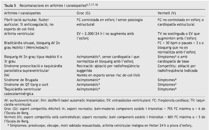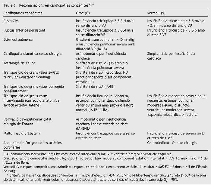 L’objectiu d’aquesta revisió és resumir les principals anomalies i cardiopaties que es poden trobar en esportistes i pretén donar una recomanació i una pauta general de l’actitud a seguir en el cas de la recomanació de l’aptitud cardiològica per a la pràctica esportiva prenent els principals grups de malalties cardíaques, és a dir: miocardiopaties (taula 3), valvulopaties i aorta (taula 4), arítmies i canalopaties (taula 5), i cardiopaties congènites (taula 6). Per a cada una de les alteracions s’atorga una pauta de la intensitat d’exercici recomanat segons el tipus d’esport recreatiu o competitiu. Amb l’objectiu de simplificar aquestes indicacions s’atorga el color vermell si l’esport competitiu està contraindicat i l’esport recreatiu està permès si és de component estàtic baix (Mitchell I) i es practica a una intensitat menor al 0% FC màxima o menor al 5 de l’escala de Borg, i un color groc quan és permès l’esport competitiu només en els esports de la classificació de Mitchell IA (p. ex., golf, bowling) i l’esport recreatiu està permès si és d’un component estàtic baix-moderat (Mitchell I i II) i es realitza a una intensitat menor al 75% FC màxima o menor al 6 de l’escala de Borg. Tanmateix, cal destacar que la decisió ha de ser sempre individualitzada i personalitzada, segons la severitat de la cardiopatia, les comorbiditats del subjecte, la modalitat i disciplina esportiva que es practiqui i, de forma important, també l’entorn personal del subjecte.