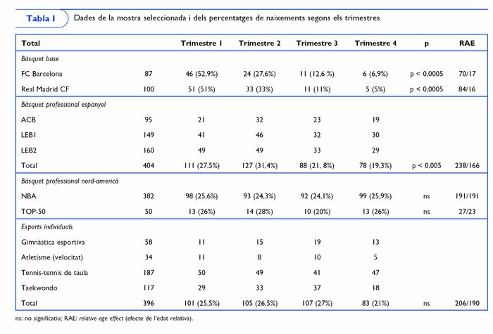 La distribució de la data de naixement per trimestres dels grups de referència, el bàsquet base i el bàsquet professional espanyol, es mostren en la taula 1, comparats amb els grups dels jugadors de la NBA i el grup d'esportistes d'esports individuals. Les dades emprades s'estandarditzen percentualment per a una manipulació i interpretació més còmoda. En la columna RAE s'observa la proporció en nombre de naixements entre la primera meitat i la segona meitat de l'any.