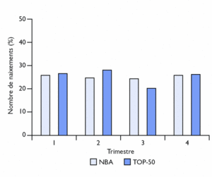 Tot seguit vam analitzar si aquesta tendència observada en el basquetbol espanyol apareix semblantment en la NBA, la competició que tothom pren com a model. Els resultats observats són diferents als que s'observen a l'àmbit espanyol. No hi ha diferències significatives quant al percentatge de naixements entre els 4 trimestres de l'any (r = -0,07, valor del test = 0,39). Aprofitant la recent selecció dels 50 millors jugadors de la NBA de tots els temps, se n'avaluen les mateixes dades i s'observa que els resultats són semblants als actuals de tota la NBA. No hi ha diferències significatives entre un trimestre i un altre (r = -0,30, valor del test = 0,72; fig. 2).