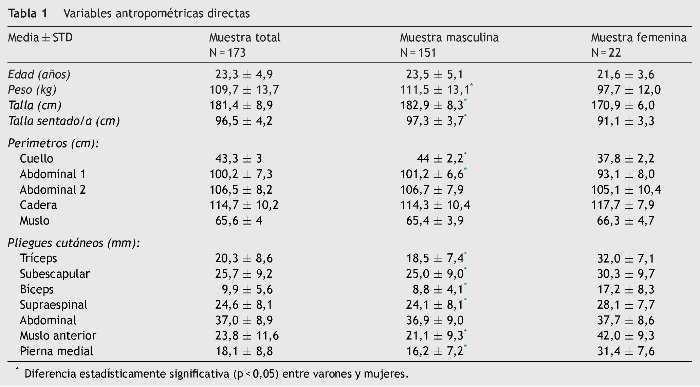 ResultadosLas características antropométricas generales de la muestra total de los 173 deportistas y según sexo se recogen en la Tabla 1. Se encontraron diferencias significativas entre la muestra masculina y la femenina, teniendo los varones valores superiores, excepto en: la edad; en los perímetros abdominal 2, cadera y muslo; y en el pliegue de abdominal cuyos valores fueron similares. En el perfil de pliegues las mayores diferencias se dieron en los pliegues de las extremidades.