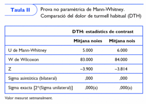 La prova no paramètrica de Mann-Whitney va donar diferències significatives tant en nois com en noies. Com ens va indicar la U de Mann-Whitney en ambdós sexes, el dolor de turmell habitual i el dolor de turmell al més intens del primer trimestre van ser superiors al segon (taula II).