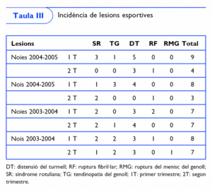 En la taula III es mostren les lesions d'extremitat inferior produïdes durant la temporada d'estudi i les lesions produïdes durant les mateixes dates, però l'any anterior. Com es pot observar, en el cas de les noies el total de lesions d'extremitat inferior passen de 9 el primer trimestre a 4 el segon trimestre en la temporada 2004-2005; en la temporada 2003-2004 passen de 7 a 7, és a dir, es mantenen. En el cas dels nois, el total de lesions d'extremitat inferior passen de 8 a 3 en la temporada 2004-2005 i de 8 a 7 en la 2003-2004.