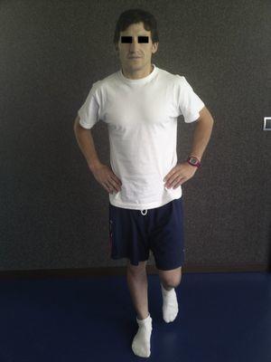 • Test SBT. El sujeto se colocaba descalzo, de pie, con las manos en la cadera y los ojos cerrados (Figura 1)3, 19, 20, 21. Elevaba una pierna (que podía moverse libremente sin apoyarse ni en el suelo ni en la pierna de apoyo) y se activaba el cronómetro, que se detenía cuando se consideraba «fin del ensayo»3 (abrir los ojos o perder el equilibrio, ya sea apoyando la pierna libre, quitando las manos de la cadera o moviendo el pie de apoyo). El tiempo máximo para cada ensayo era de 180s2; además, se concedía un descanso de 2min entre cada ensayo, que incluyó estiramientos de cuádriceps, isquiotibiales, aductores, abductores, tibial y gemelo.