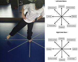 Figura 2. Realización del Star Excursión Balance Test.Left limb stance=Apoyo en la pierna izquierda.Right limb stance=Apoyo en la pierna derecha.