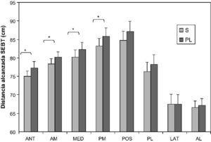 Figura 3. Promedios y error estándar obtenidos en el Star Excursion Balance Test (SEBT) entre las situaciones control (S) y placebo (PL). ANT: anterior; AM: anteromedial; MED: medial; PM: posteromedial; POS: posterior; PL: posterolateral; LAT: lateral; AL: anterolateral. *=p<0,05.