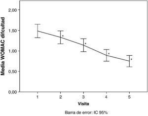 Figura 1. Evolución del valor medio de la escala WOMAC Incapacidad Funcional (dificultad) e intervalo de confianza del 95%. Diferencias estadísticamente significativas (*p<0,01) para las comparaciones dos a dos respecto a la primera visita (método de Bonferroni).