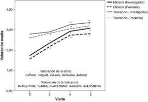 Figura 3. Evolución del valor medio de la eficacia y la tolerancia del tratamiento valorados por el investigador y por el paciente. Comparaciones dos a dos respecto a la segunda visita (método de Bonferroni, *p<0,01).