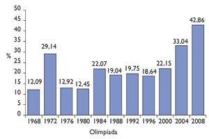 Els primers anys de lluita contra el dopatge, el percentatge d'esportistes sotmesos a controls presenta alts i baixos constants, alguns molt accentuats; així, a Munic 1972 el 29,14% dels esportistes van ser sotmesos a controls, mentre que en els Jocs Olímpics anterior i posterior aquest percentatge es mantenia pròxim al 12-13%. Des d'Atlanta 1996 fins als últims Jocs, a Beijing 2008, el percentatge d'esportistes sotmesos a proves antidopatge ha augmentat considerablement (18,64% vers 42,86%) (fig. 2).