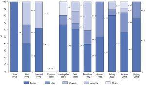 Excepte els Jocs Olímpics de Moscou 1980, en la resta sempre hi ha hagut casos positius de dopatge d'esportistes europeus. Oceania i Àfrica són els continents que menys sancions acumulen per dopatge (2 i 4 positius, respectivament, des de 1968).