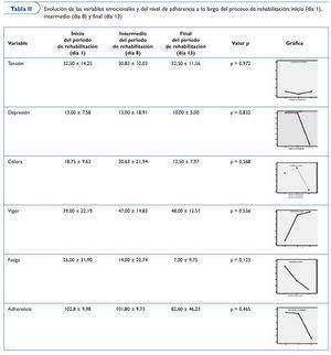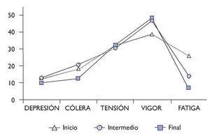 Sin embargo, en la tabla II se observa que los valores inicial, intermedio y final muestran un mantenimiento en la dimensión negativa tensión y una marcada tendencia al descenso de las dimensiones negativas depresión y fatiga), mientras que en la dimensión también negativa cólera existe una subida puntual hacia la mitad del período de rehabilitación. Por otra parte, la dimensión positiva vigor parece mostrar un incremento en su evolución general a lo largo del tiempo, siendo ésta mucho más notable hasta la mitad del período de rehabilitación.