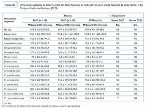 Les taules II i III mostren les dimensions absolutes dels grups estudiats, com també les comparacions univariades (p < 0,05) dels ballarins de ballet versus els de dansa moderna i folklòrica.