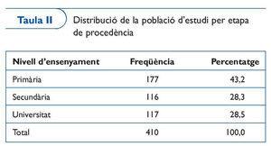 La distribució de subjectes de 6 a 30 anys per centre de procedència va ser bastant homogènia, com es mostra en la taula II, considerant que la mostra es va agafar de 1r, 2n i 3r cicle de primària (n = 177), secundària (1r i 2n cicle d'ESO) amb 116 nois/noies (28,3%), i 1r, 2n i 3r curs de Fisioteràpia (n = 117); però en aquest últim grup hi havia rangs d'edat molt poc representats, tot i que es van tenir en compte i es van incloure en el nostre estudi per establir els grups al 100%.