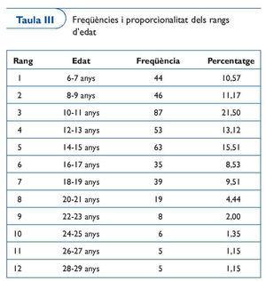Com mostra la taula III, el rang 3 (10-11 anys) és el més representat (n = 87); en canvi, els rangs 10, 11 i 12, amb proporcions entorn de l'1%, són els que menys subjectes van presentar.