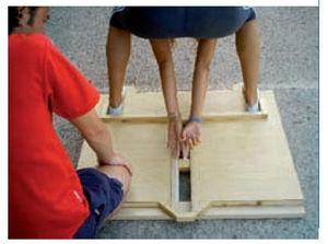 La forma de realització és amb el subjecte col·locat en bipedestació, sense calçat i els talons que coincideixin amb les línies marcades al nivell del zero de l'escala, i tot seguit passar a executar la prova de flexió profunda del tronc, que ha d'anar acompanyada de flexió de genolls, a fi d'arribar amb les mans (que han passat entre les dues cames) tan endarrere com sigui possible sobre el regle centímetre. Cal mantenir la posició fins que es llegeixi la distància aconseguida en centímetres. Per fer aquesta prova es van tenir en compte les normes següents: no permetre separar del terra o la taula cap part dels peus, mantenir l'equilibri i sortir per davant de l'aparell però restant sense moure's fins a mesurar la distància. Es feien dos intents, amb anotació del millor, sense tenir en compte les fraccions de centímetre, sinó arrodonint al centímetre més pròxim. El material utilitzat va ser una post de fusta (0,76 per 0,88 m) amb regle graduat mòbil, com es mostra en la figura 2.