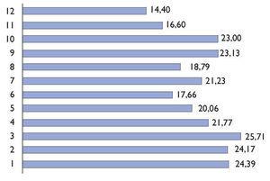 D'aquesta figura anterior s'extreu que el rang 3 (10-11 anys) és el que va presentar més flexibilitat mitjana (X = 25,71 cm), i els subjectes del rang 12 (X = 14,40 cm) van ser els que menys valor van obtenir. Aquestes diferències quant als rangs d'edat van quedar reflectides estadísticament (p = 0,00).