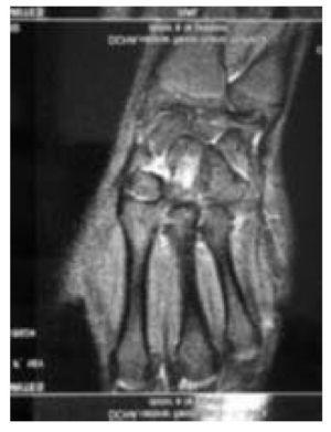 Degut a la llarga evolució de la lesió, es realitza ressonància magnètica (RM), que mostra una imatge suggestiva de fractura trabecular a nivell de l'os gran del carp dret amb escàs vessament i sinovitis de tendons extensors (fig. 2). Es complementa l'estudi amb escàner (TC), que mostra una fractura no desplaçada de cara volar de l'os gran en el seu terç mitjà sense desplaçament de fragment (fig. 3).