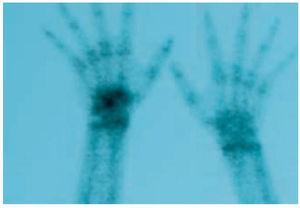 Davant la raresa de la lesió, l'estudi es completa amb una gammagrafia òssia (fig. 4), en la que s'observen fenòmens osteogènics actius secundaris a fractura d'os gran de la mà dreta ja coneguda.
