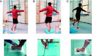 Figura 1. Los tres tests de equilibrio: sobre superficie estable (directamente sobre la plataforma de fuerzas) (A), sobre superficie viscoelástica (B) y con estimulación eléctrica neuromuscular (C). En las imágenes de abajo se observa el ajuste de la huella al sistema de referencia. Para ello en A y C se usó el fotopodograma, mientras que en B se usó una planilla de madera.