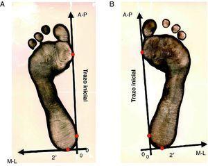 Figura 2. Sistema de referencias originado en el lugar de corte del trazo inicial (que coincide con la arista interna de la base de sustentación) con la línea 2’ 19 .El trazo inicial es la línea que une las prominencias de antepié y mediopié en el borde interno de la huella, mientras que la línea 2’ es perpendicular al trazo inicial pasando por el punto más posterior de la huella. Huellas plantares del pie izquierdo (A) y derecho (B); y los ejes cartesianos AP (anteroposterior) y ML (mediolateral) originados en dicho lugar (0,0).