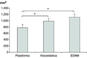 Áreas barridasLas mayores «áreas barridas por el COP» se obtuvieron en el test con EENM (1.115,96±411,40 mm2), y las menores en el test realizado sobre superficie viscoelástica (779,71±312,90 mm2). No se obtuvieron diferencias significativas al comparar los 3 tests de equilibrio conjuntamente. Sin embargo, si los comparamos de forma aislada (mediante la T de Student) se observan mayores áreas sobre la superficie viscoelástica que sobre la superficie estable (p<0,05) (Figura 4). Los colchones y superficies viscoelásticas y de espuma dificultan la realización de los tests de equilibrio al perturbar la información propioceptiva que se recibe20, 26, cayendo mayor peso en los sistemas vestibular y visual del equilibrio. Entre la superficie viscoelástica y la EENM las diferencias no fueron significativas.