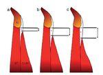 Figura 1. La longitud del tendó lliure proximal del CLBF es mesura (en cm) des del marge més inferior de la tuberositat isquiàtica fins al punt en què les primeres fibres musculars comencen a inserir-se al tendó. a) Tendó lliure curt. b) Tendó lliure mitjà. c) Tendó lliure llarg.
