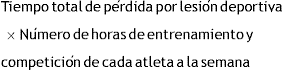 En un segundo acercamiento, para calcular la evaluación del número total de lesiones acontecidas que han obligado al menos un día a abandonar la práctica deportiva al deportista, utilizaron otra fórmula, sustituyendo el número de días perdidos por el número total de lesiones acontecidas reflejándose una incidencia de lesión por 1.000 h. En otro de los estudios de esta revisión22, para ajustar la variación del número total de horas de práctica y de competición en cada uno de los deportes, se utilizó la siguiente fórmula: