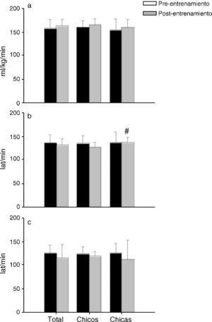 * p≤0,05 entre chicos y chicas; # p<0,05 entre preentrenamiento y postentrenamiento; FC: frecuencia cardíaca; VO2: consumo de oxígeno.