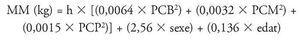 On: MM = massa muscular (kg); h = talla (m); PCB = perímetre corregit del braç (cm); PCM = perímetre corregit de la cuixa (cm); PCP = perímetre corregit cama medial o bessons (cm); sexe = valor "0" per a dones i valor "1" per a homes; edat (anys).