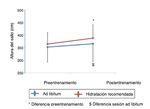 Por otra parte, la temperatura timpánica solo aumentó durante el entrenamiento en la sesión en la que se dieron recomendaciones de hidratación (p < 0,01), mientras que la temperatura se mantuvo estable en la sesión con hidratación ad libitum (p = 0,07). No hubo diferencias entre las medidas previas en ambas sesiones, a diferencia de los valores de la temperatura timpánica obtenidos después de las sesiones de entrenamiento, en que los jugadores presentaron una temperatura más elevada después del entrenamiento con recomendaciones de hidratación en comparación con la sesión de hidratación ad libitum (p < 0,01). En este caso se produjo la interacción entre el tratamiento y el tiempo (p < 0,01) (tabla 2).