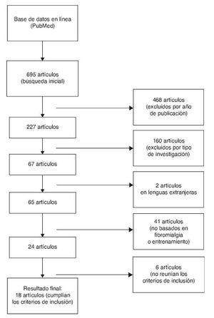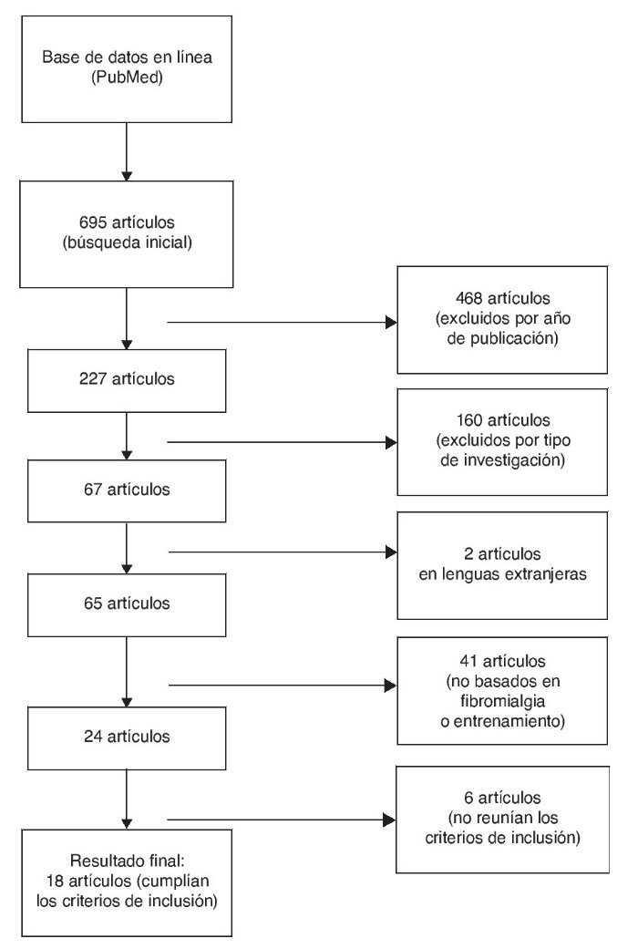 Para la búsqueda se emplearon los términos «fibromialgia», «tratamiento» y «terapia» combinados con el término «ejercicio» mediante el operar booleano «y». Como resultado, se encontraron 695 estudios. Los criterios de inclusión se cumplieron en 18 de estos estudios (fig. 1).