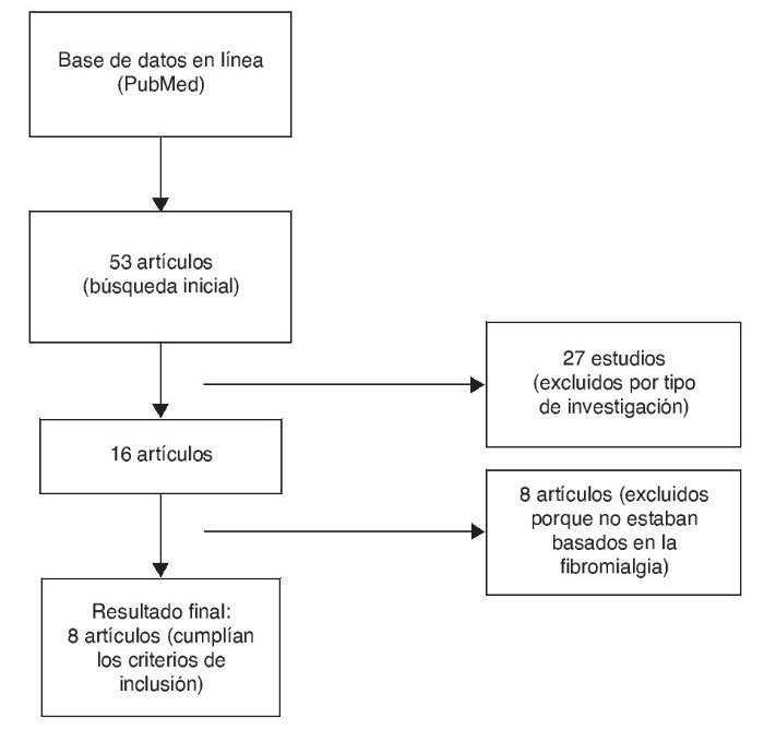 Se realizó una búsqueda bibliográfica sobre el tipo de ejercicios llevados a cabo para combatir los síntomas de la fibromialgia8. Se revisó la literatura disponible en la base de datos de Medline a través de PubMed, desde el 1 de noviembre de 2010 hasta el 1 de noviembre de 2015. Los criterios de inclusión fueron ensayos clínicos incluidos en estudios basados en participantes que padecían fibromialgia y publicados a partir de 2010 en inglés o en español. Los criterios de exclusión fueron artículos basados en estudios no finalizados o en investigaciones cuya área de intervención no se relacionó con la fisioterapia o con el ejercicio terapéutico.
