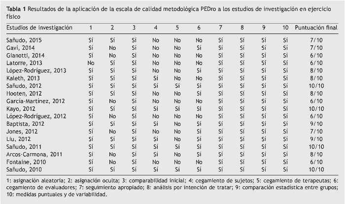 Con el fin de validar la calidad metodológica de los estudios seleccionados se utilizó la escala PEDro, la base de datos de fisioterapia basada en la evidencia. Presenta 11 elementos de respuesta («sí», «no», «no informa»). Solo 10 de ellos fueron evaluables, debido a que el primero no se puede contar, ya que se refiere a la validez externa del estudio. Se da un punto a los elementos «sí», mientras que no se otorga ninguna de puntuación al resto de ellos. Algunos autores, por ejemplo Moseley et al.18, afirman que obtener 5 puntos o más significa una buena calidad metodológica y bajo riesgo de sesgo.