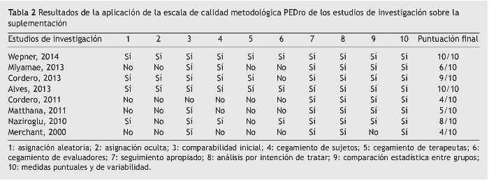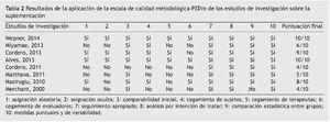 En cuanto a los estudios basados en suplementos, dos de ellos administraron la coenzima Q1015-17, dos estudios se centraron en la vitamina D13,14, un estudio se basó en las vitaminas C y E unidas a la realización de ejercicio34, un estudio fue sobre la creatina35 y, finalmente, un estudio sobre las algas Chlorella pyrenoidosa36. La duración de todos estos estudios sobre suplementos fue variable. La duración media fue de 22,14 ± 16,07 semanas. Este resultado prácticamente no muestra variación cuando los datos se extraen de la baja calidad metodológica (22,2 ± 17,01 semanas). El promedio de participantes tampoco muestra ninguna variación cuando se excluyen los tres estudios de escasa calidad metodológica (43,4 ± 24,69 participantes) en comparación con los 42,5 ± 33,29 participantes si se consideran todos los estudios (tabla 4).