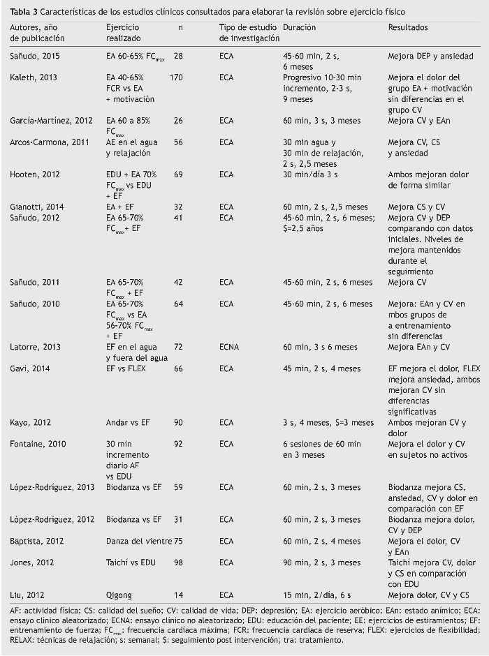 Resultados: La evidencia mostró que el dolor y la calidad de vida mejoraban con la práctica de casi todo tipo de actividad física y con la ingesta de la coenzima Q10 o suplemento de vitamina D. La calidad del sueño mejoraba mediante la combinación de ejercicio físico y relajación. La depresión, la ansiedad y el estado de ánimo mejoraban con la práctica de ejercicio aeróbico, ejercicios de flexibilidad y biodanza acuática.