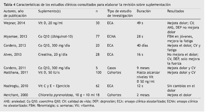 Respecto a los suplementos, Alves et al.35 reportan que una cantidad de 20 g de creatina por día no mejora la calidad de vida. Wepner et al.13 tampoco informaron de ninguna mejora al administrar 20 mg/ml de vitamina D. Sin embargo, Matthana14 argumenta que la calidad de vida de los pacientes mejora cuando se administra 50 ng/ml de vitamina D. Esta diferencia en los resultados puede ser debida al sesgo en el estudio de Matthana; por ejemplo, la falta de control y los grupos de placebo o la administración de una dosis insuficiente por Wepner. En consecuencia, la vitamina D no puede ser recomendada para mejorar la calidad de vida de los pacientes hasta que se publiquen datos más fiables. Distintos estudios de Cordero et al.16,17 afirman que la calidad de vida de 25 pacientes con fibromialgia mejoró cuando se les administró una dosis de 300 mg de coenzima Q10 por día. Resultados similares fueron confirmados por Matthana14; sin embargo, en este estudio la vitamina D sustituyó a la coenzima Q10, y la cantidad administrada fue de 50 ng/ml por paciente.