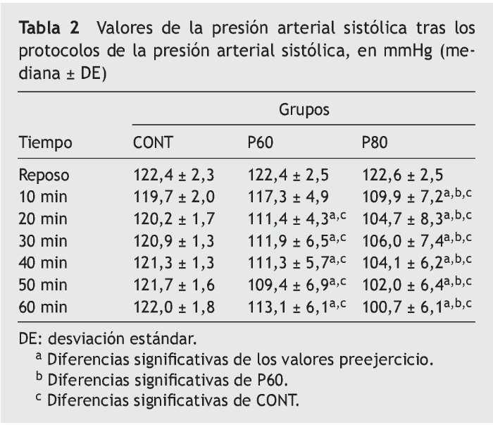 El análisis estadístico se llevó a cabo utilizando en primer lugar la prueba de normalidad de Shapiro-Wilk y el test de homocedasticidad (criterio de Bartlett). La PA mostró distribución normal y homocedasticidad (p > 0,05). Se utilizó un ANOVA de 3 vías de mediadas repetidas (grupo [P60 vs P80 vs CONT] × tiempo [reposo vs inmediatamente después vs 10 min vs 20 min vs 30 min vs 40 min vs 50 min vs 60 min]) seguido del test de Tukey post hoc para analizar las posibles diferencias en PAS, PAD y PA media. El nivel de significación se estableció en p < 0,05. Todos los análisis estadísticos se llevaron a cabo con el software estadístico SPSS, versión 20.0 (SPSS Inc., Chicago, IL, EE.UU.).