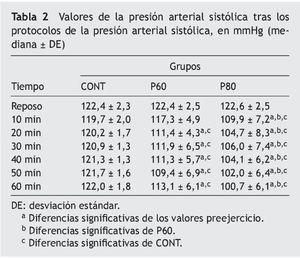 Hubo una interacción significativa de 2 vías en grupo × tiempo (p < 0,05) en PAS y PAD. P60 mostró resultados hipotensores en PAS y PAD después de 20 min comparado con los valores basales (p < 0,05, tablas 2 y 3).