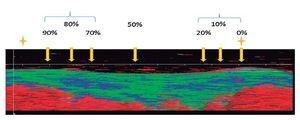 Un mateix observador cec quantificà l’ecopatró de la UTC per a l’historial del pacient. De cada punt de tall proposat, es determinà una regió d’interès (RDI). L’observador determina l’RDI traçant-la al voltant de la vora del tendó en la visió transversal. El mateix programari UTC (UTC 2010) realitza l’anàlisi de l’ecopatró utilitzat per a l’escaneig en cada punt de tall. El programari interpola les RDI creant un volum de tendó en què la proporció de cada ecotipus (i, ii, iii i iv), basada en l’estabilitat de la lluentor dels píxels sobre imatges contínues, permet valorar l’alineament correcte de les fibres (fig. 5).