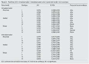 A la taula 2 es poden observar els resultats obtinguts en als 2 nivells d’anàlisi (intraobservador i interobservador) de les 3 zones del tendó i els 4 ecotipus diferents. En el nivell intraobservador, els resultats mostren una fiabilitat alta en els 4 ecotipus de la zona proximal del tendó (p = 0,001). També es mostra una validesa alta dels ecotipus i, ii i iii de la zona medial, essent l’ecotipus iv el que reflecteix una fiabilitat menor (p = 0,017). A la zona distal, els ecotipus i i ii mostren una fiabilitat alta o bona (p < 0,001), mentre que la dels ecotipus iii i iv és baixa o pobre (p = 0,014). En el nivell interobservador, la zona proximal també presenta una fiabilitat alta en els 4 ecotipus (p = 0,001). Les zones medial y distal presenten una fiabilitat alta en els ecotipus i i ii (p < 0,001). A l’ecotipus ii la fiabilitat és bona en la zona medial i alta en la distal (p < 0,001). Quant a l’ecotipus iv, s’observa una fiabilitat alta a la zona proximal (p = 0,001), una fiabilitat bona a la zona distal (p = 0,001) i una fiabilitat pobre (no significativa) a la zona medial.