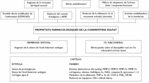 Els resultats de diversos estudis realitzats in vitro i en animals suggereixen que l'acció terapèutica de condroïtina sulfat ve donada almenys pels mecanismes d'acció següents: activitat antiinflamatòria en els components cel·lulars de la inflamació, estimulació de la síntesi de proteoglicans i àcid hialurònic endogen, reducció de l'activitat catabòlica dels condròcits (inhibint alguns enzims proteolítics com ara col·lagenasa, elastasa, proteoglicanasa, fosfolipasa A2, NAG, MMP-3, MMP-9, MMP-13, MMP-14, catepsina B i agrecanasa 1 i 2) i efecte protector dels components cel·lulars del cartílag13 (fig. 1).