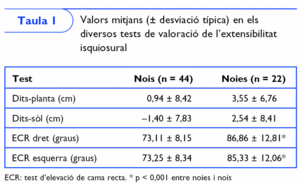 Taula 1 Valors mitjans (± desviació típica) en els diversos tests de valoració de l'extensibilitat isquiosural