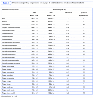 Para todos los grupos de edad del sexo femenino el peso y la estatura fueron mayores y estadísticamente significativos de un año a otro. En la muestra analizada las bailarinas más pesadas fueron las del grupo de edad III en el segundo corte (50,1 ± 4,3 kg). Los diferenciales medios del peso corporal refieren el mayor aumento para el grupo de edad II, siendo muy pequeño el cuantificado para el grupo de edad III.