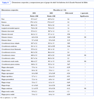 Se determinó la media y la desviación estándar de todas las variables estudiadas según el sexo de los bailarines para cada medición. Se calculó el diferencial para todas las mediciones antropométricas a partir de la resta del valor en la medición de 2002 a la medición de 2003. Las comparaciones univariadas entre las mediciones, tomadas en los momentos del estudio, para cada grupo de edad se realizaron utilizando la prueba t de Student para datos apareados (p < 0,05).